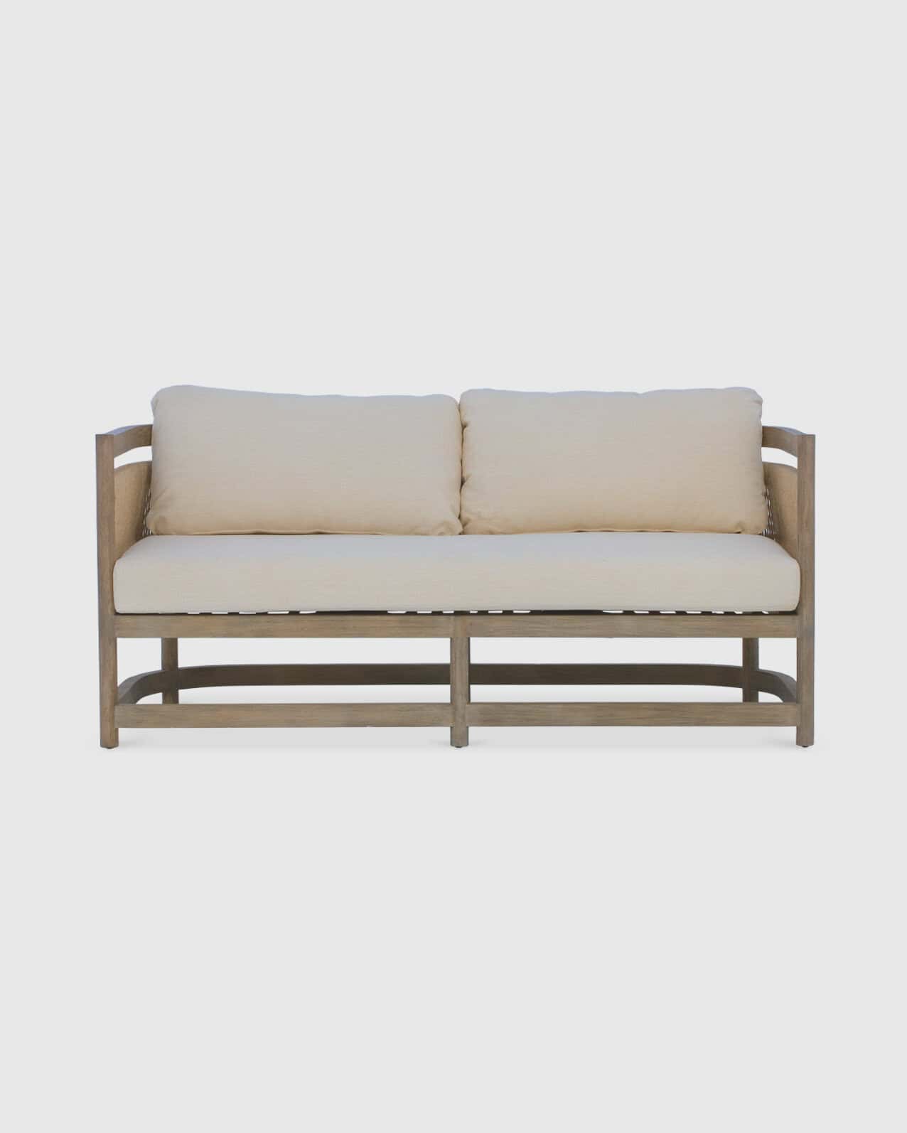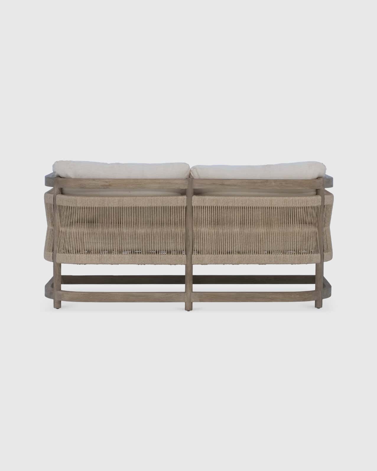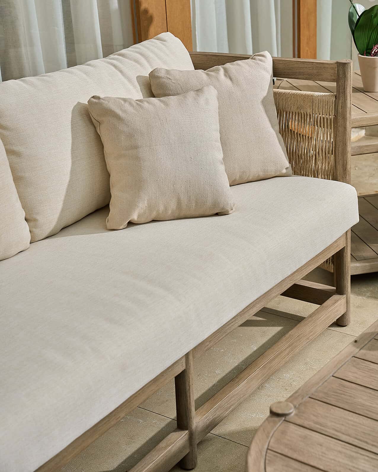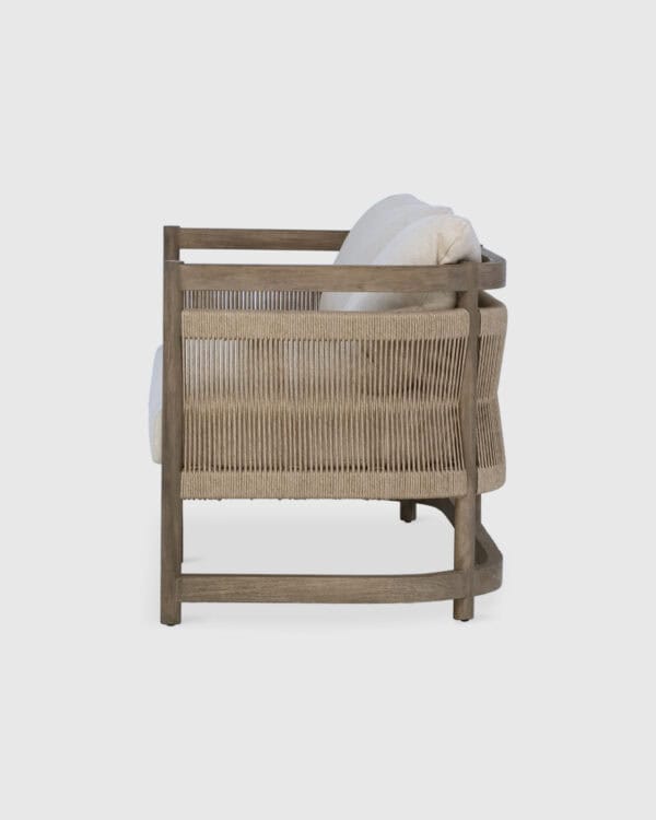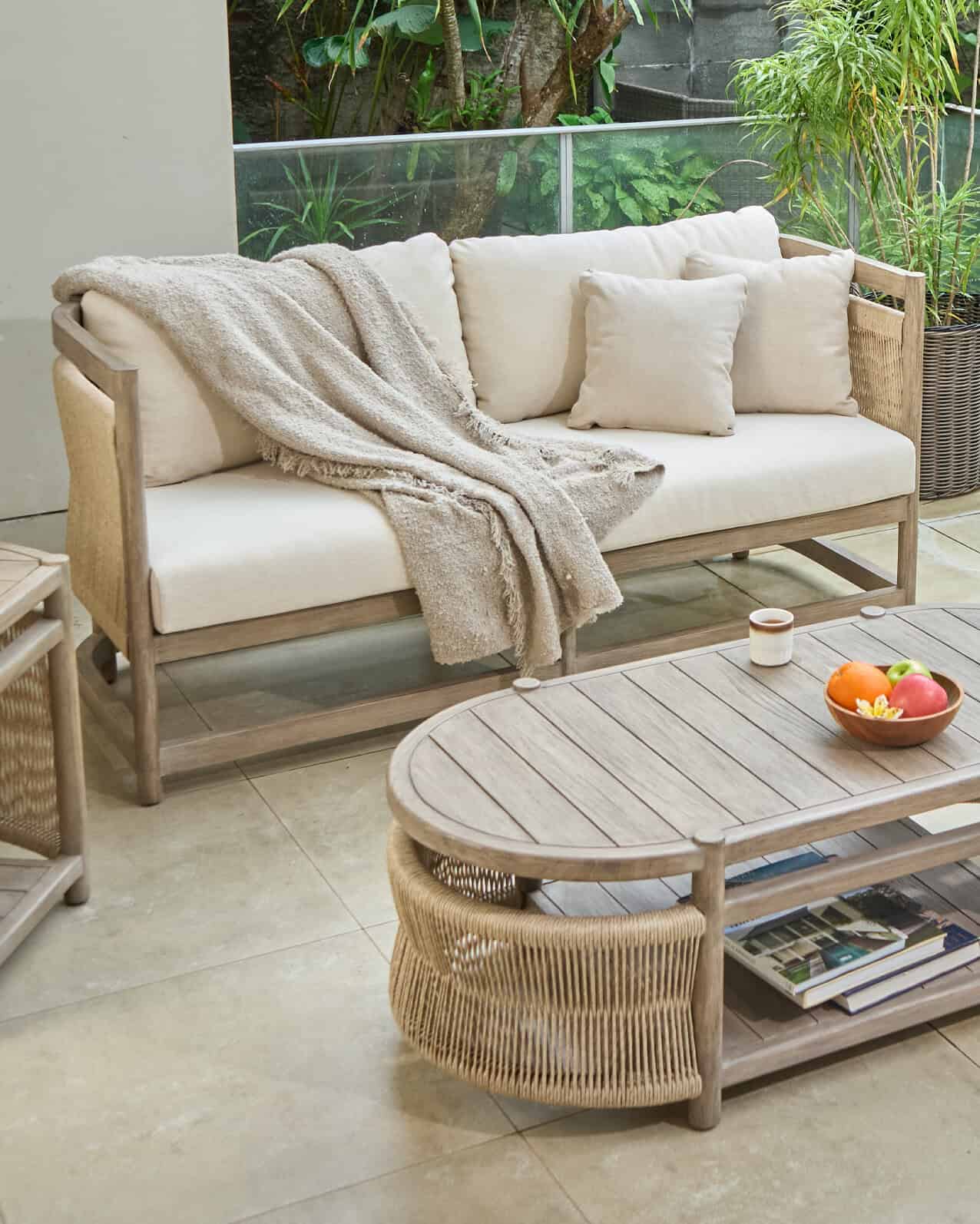 : Teak, Synthetic Rattan, Outdoor Foam, Outdoor Fabric.