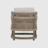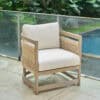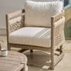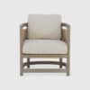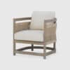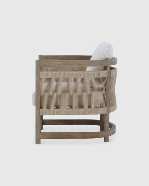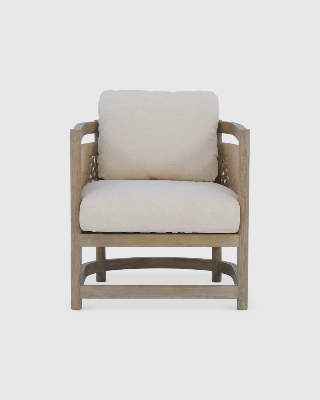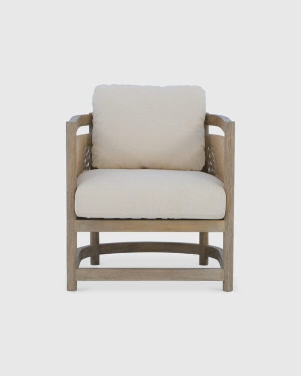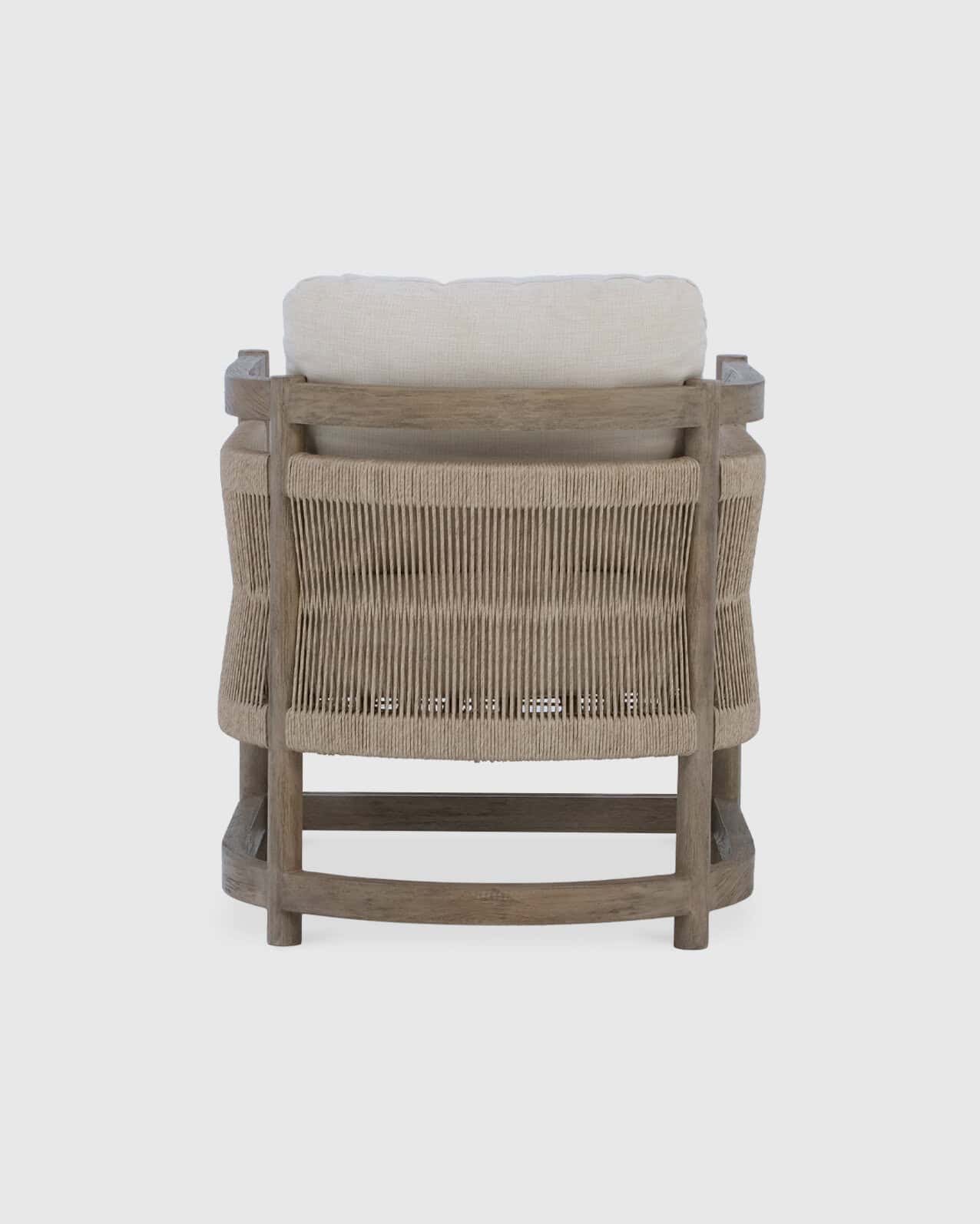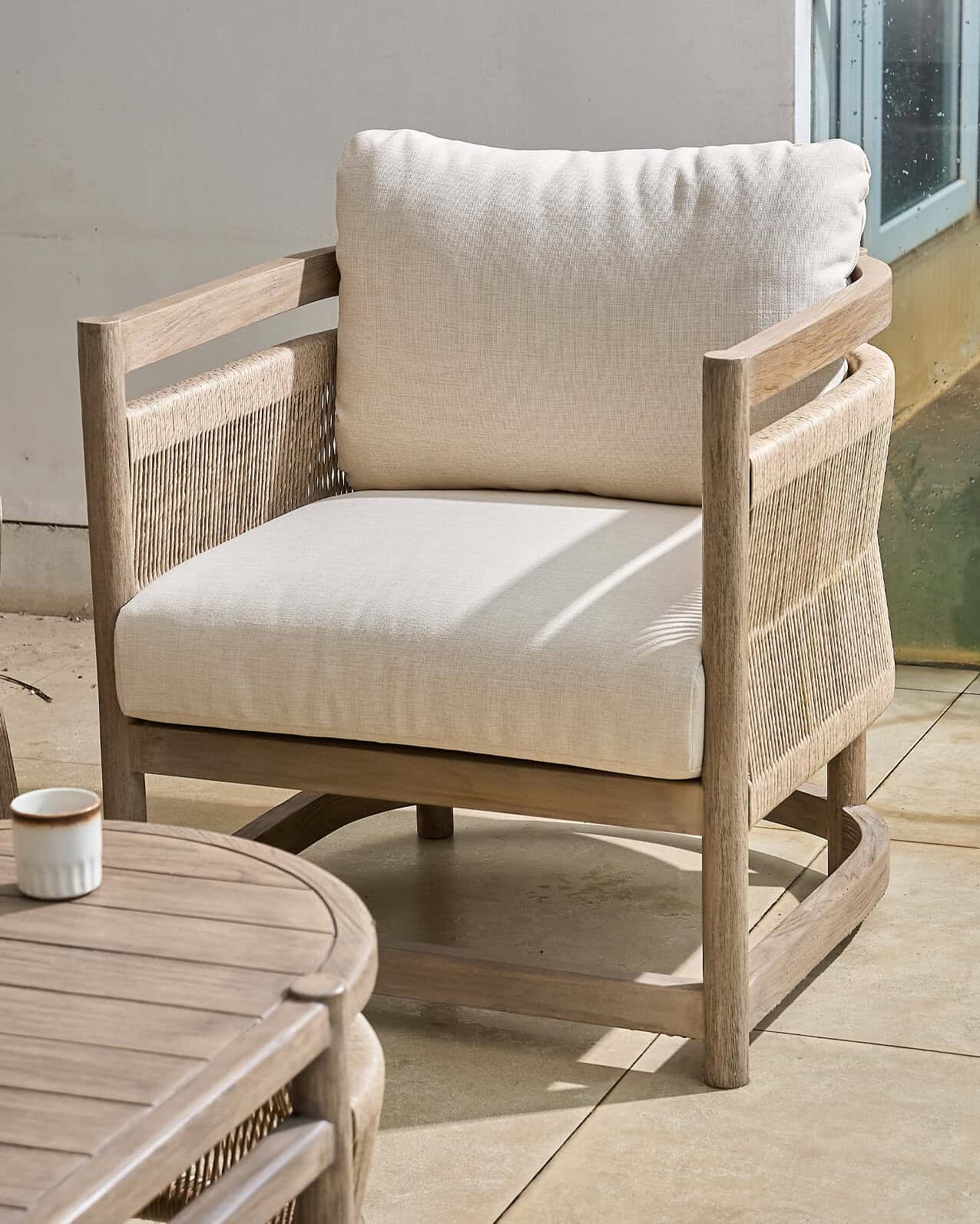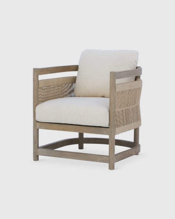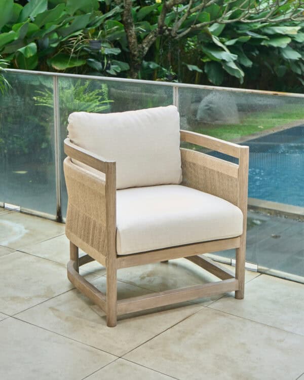 : Teak, Synthetic Rattan, Outdoor Foam, Outdoor Fabric.