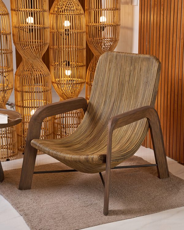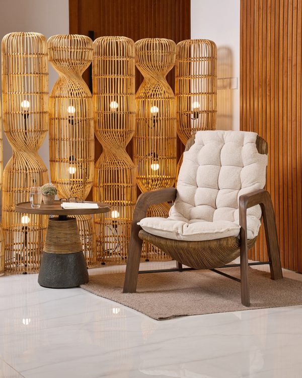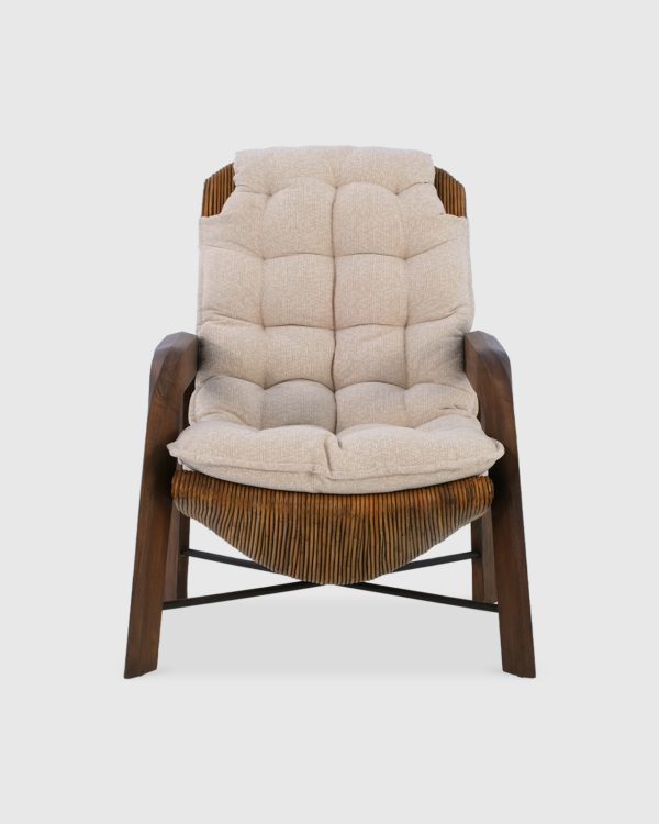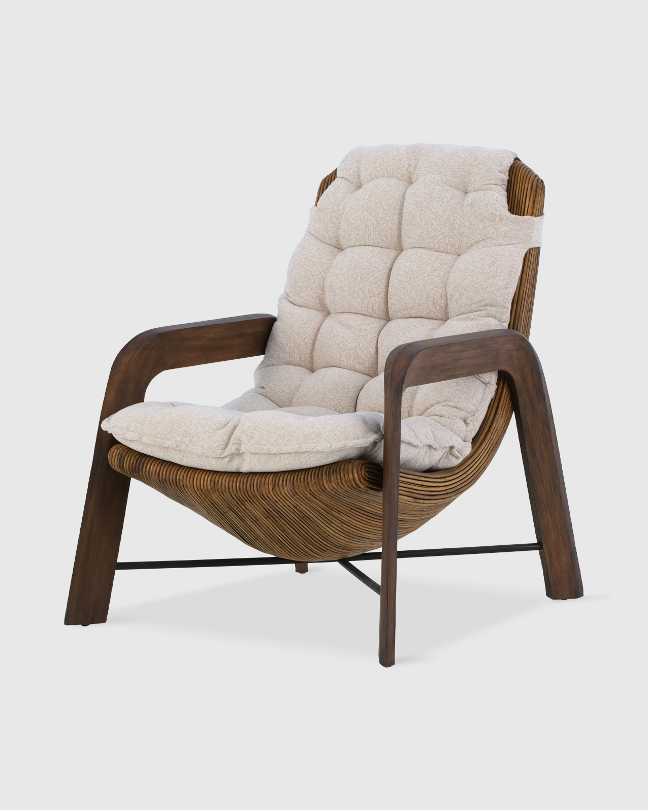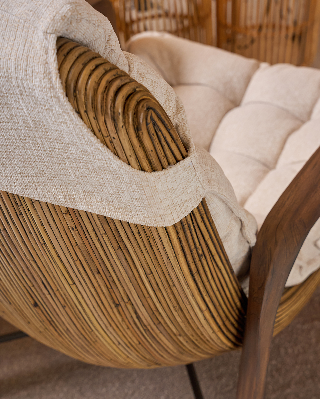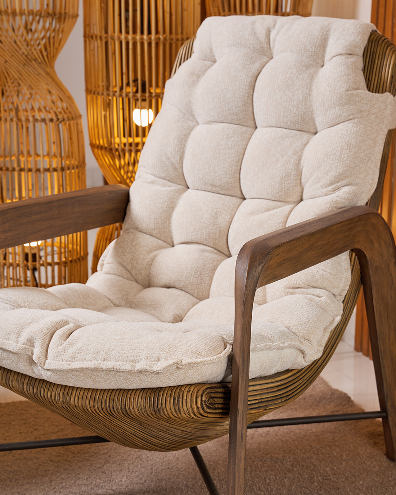 : Teak, Iron, Natural Rattan, Plywood, Indoor Foam, Indoor Fabric.