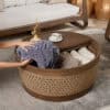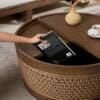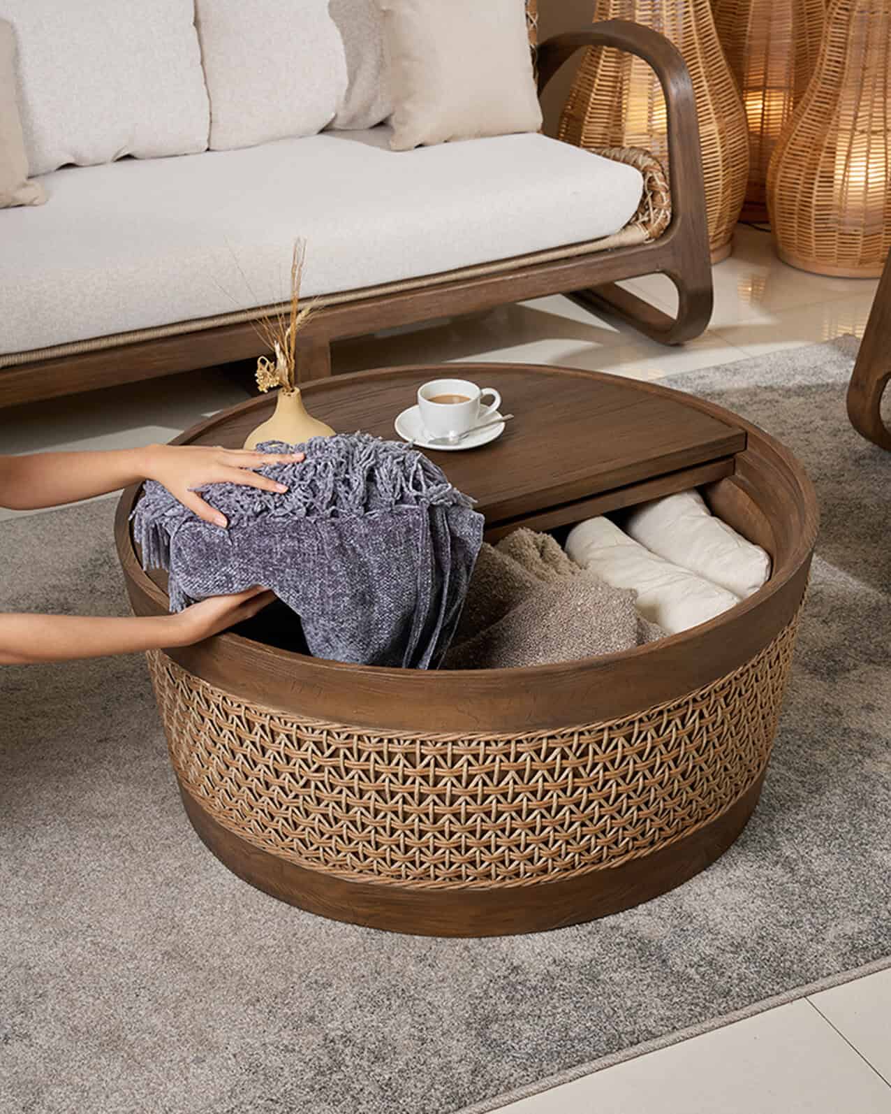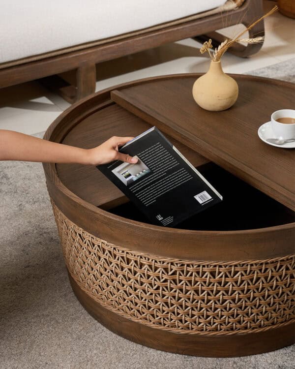 Elevate your living collection with MILTON. This beautiful coffee table combines a warm wood grain with an intricate, dual-colored synthetic weave. The top glides open to reveal a hidden storage for cushions, throw pillows, and many more. A statement piece for a clutter-free modern lifestyle.