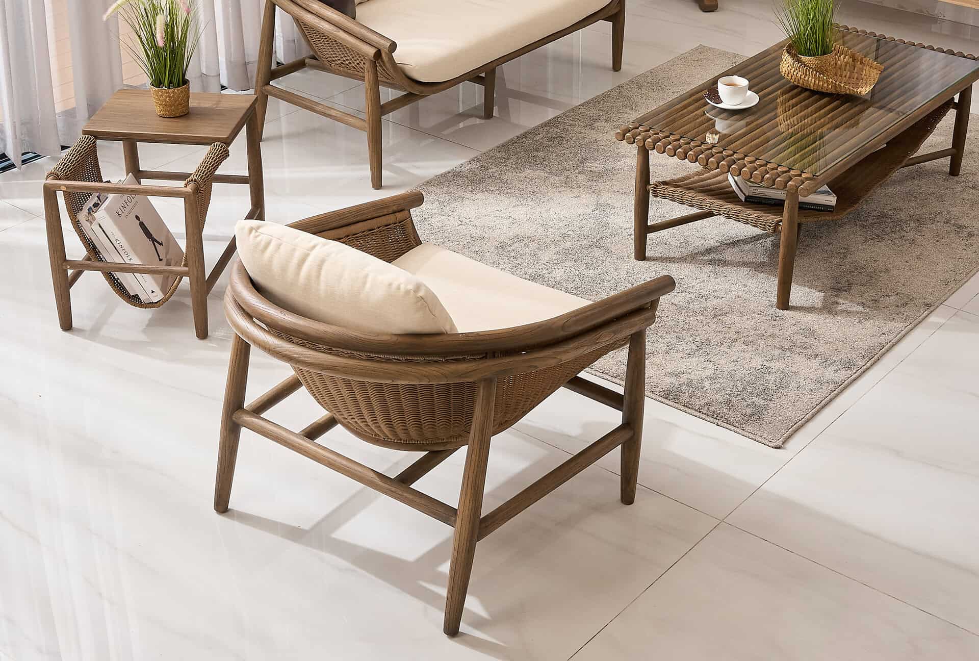 : Sungkai Wood, Iron, Synthetic Rattan, Indoor Foam, Indoor Fabric.